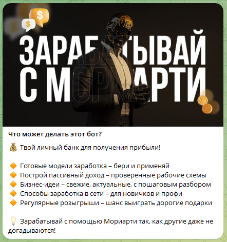 Автор Moriarty Market предлагает широкий ассортимент цифровых товаров и схем. В боте продаются цифровые товары. Они позиционируются как инструменты для получения прибыли, но их содержание относится к высокорисковым и зачастую противоправным моделям заработка. Разработчик не публикует информацию о рисках использования подобных схем.