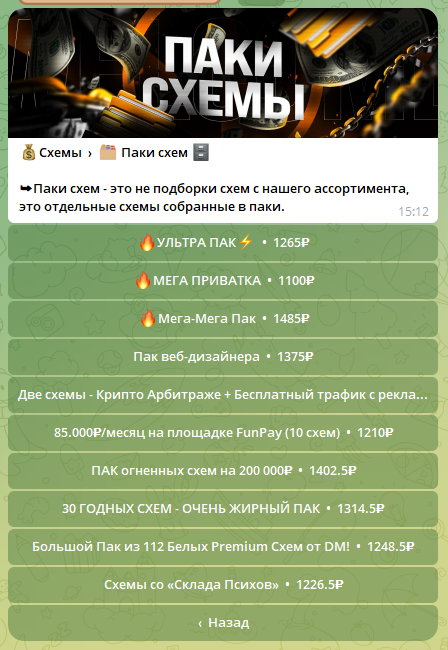 Шоп Мориарти представляет собой проект с продажей цифровых схем и материалов, ориентированных на быстрый доход без юридической прозрачности и без подтвержденной эффективности. Ассортимент бота включает высокорисковые категории, использование которых может привести к блокировкам аккаунтов и финансовым потерям.