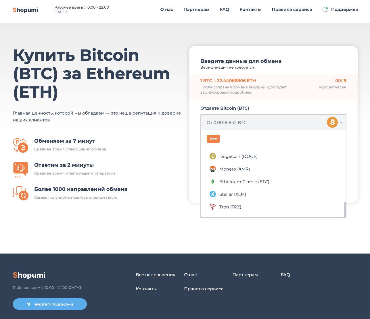 Shopumi — криптовалютный обменник, о котором почти никто не знает. Владельцы сервиса обещают завершить эксчейндж за 7 минут после того, как клиент создаст и оплатит заявку.