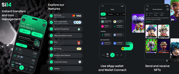 Кошелек Si14 заявлен в качестве мобильного платежного средства нового поколения. Он позволяет легко управлять всеми цифровыми активами, включая NFT, не имеет скрытых комиссий. Старт проекта состоялся в 2025 году, но прошел относительно тихо.