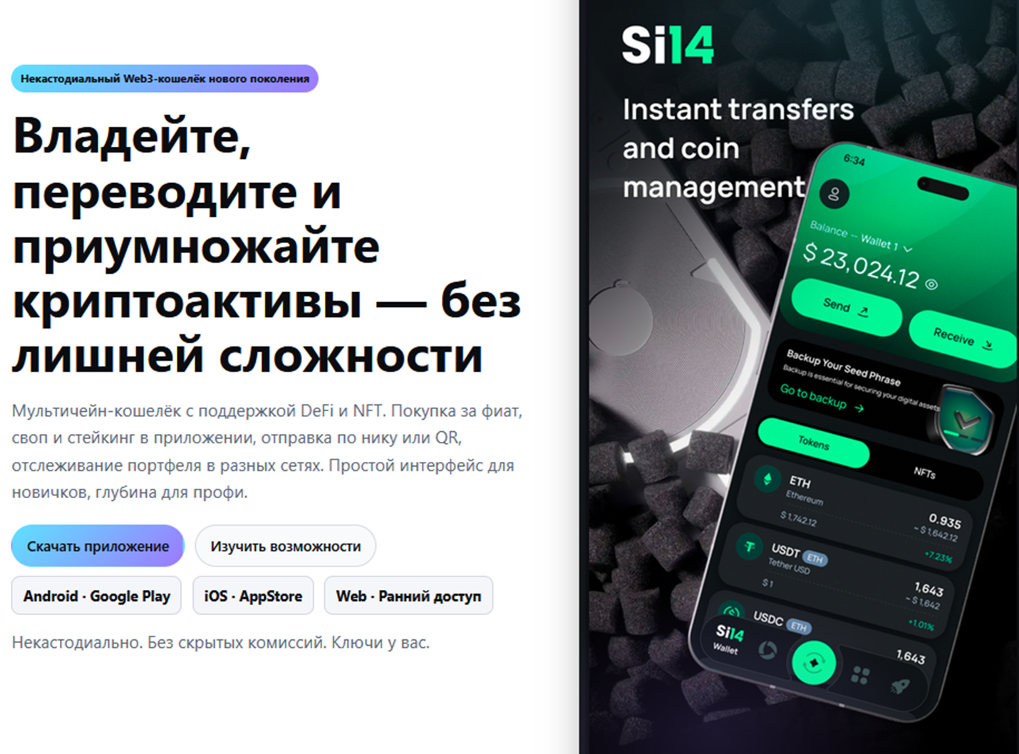 Крипто Валет Si 14 – мобильное некастодиальное средство для управления активами. Может использоваться не только для ПК или планшетов, но и для смартфонов под управлением Андроид и iOS. Регистрация кошелька в сети простая, комиссии оплачиваются через USDT (Tether).