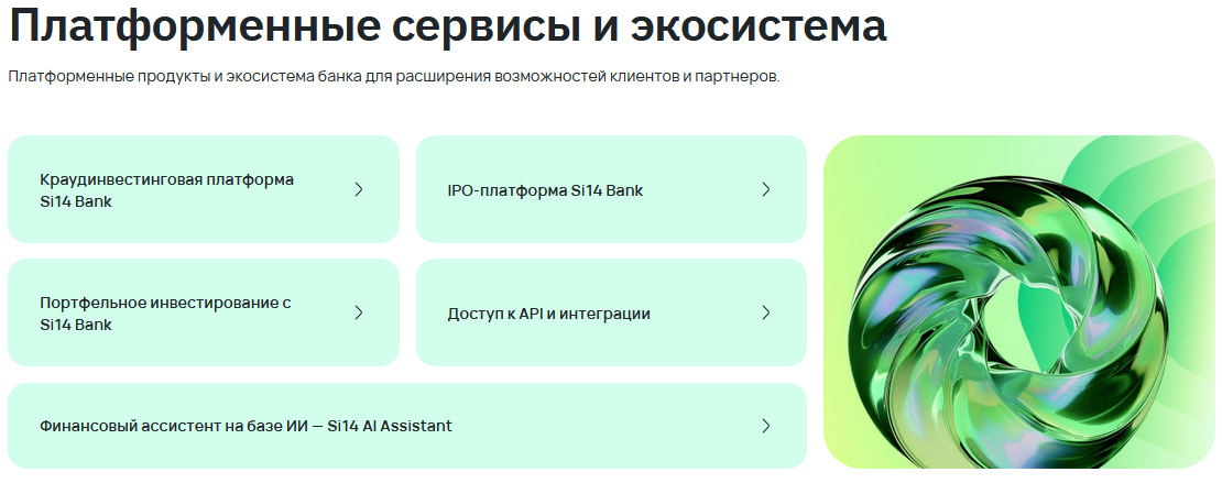 Дополнительно клиентам предлагаются доступы к API, простая интеграция, работа с IPO платформой банка Si14. Есть возможность портфельного инвестирования, работы на краудинвестинговой площадке. Также держателям кошелька предлагаются услуги финансового консультанта Al Assistant.