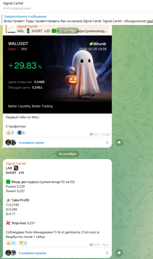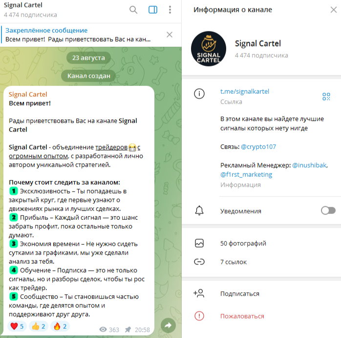 Телеграм-канал @ signalkartel был создан 23 августа 2025 года. В первой публикации авторы рассказали, что за кадром проекта стоит команда опытных трейдеров, которые работают в этой сфере уже давно. Точный свой стаж они не называют, но заявляют, что за это время успели разработать личную стратегию заработка, по которой и предлагают подписчикам работать.