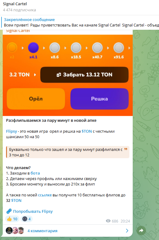 Сейчас на канале Signal Cartel действительно выходят бесплатные сигналы и отчетность сделок. К каждой публикации авторы приписывают, с каким процентом от депозита лучше торговать. Качество и эффективность таких инвестиции оценить трудно, так как отзывов от аудитории нет. Плюс, нет подтверждений тому, что авторы профессиональные трейдеры.