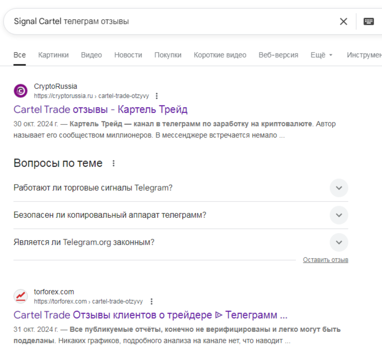 Проект Signal Cartel работает всего 2 месяца. О стаже его владельцев ничего неизвестно, как и самих людях. За этот небольшой период телеграм-канал не смог заработать успешную репутацию и хоть какие-нибудь упоминания. Положительных или отрицательных независимых отзывов от аудитории нет.