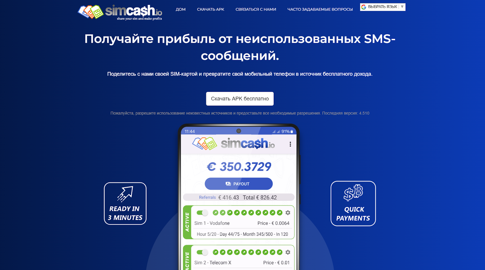 Перед заработком через SMS оператора Сим Кэш вам необходимо установить приложение, но на официальных площадках типа Google Play / AppStore его нет. На сайте разработчики предлагают нажать кнопку “download APK”, после чего скачивание начнется автоматически, однако вы должны понимать, что это рискованный шаг. Сервисы типа Google Play проверяют приложение на минимальный уровень безопасности, чего вы не увидите у SimCash. Там могут быть вирусы / стиллеры, которые приведут к потере персональных данных, а многие антивирусы не способны обнаружить современные утилиты для кражи.