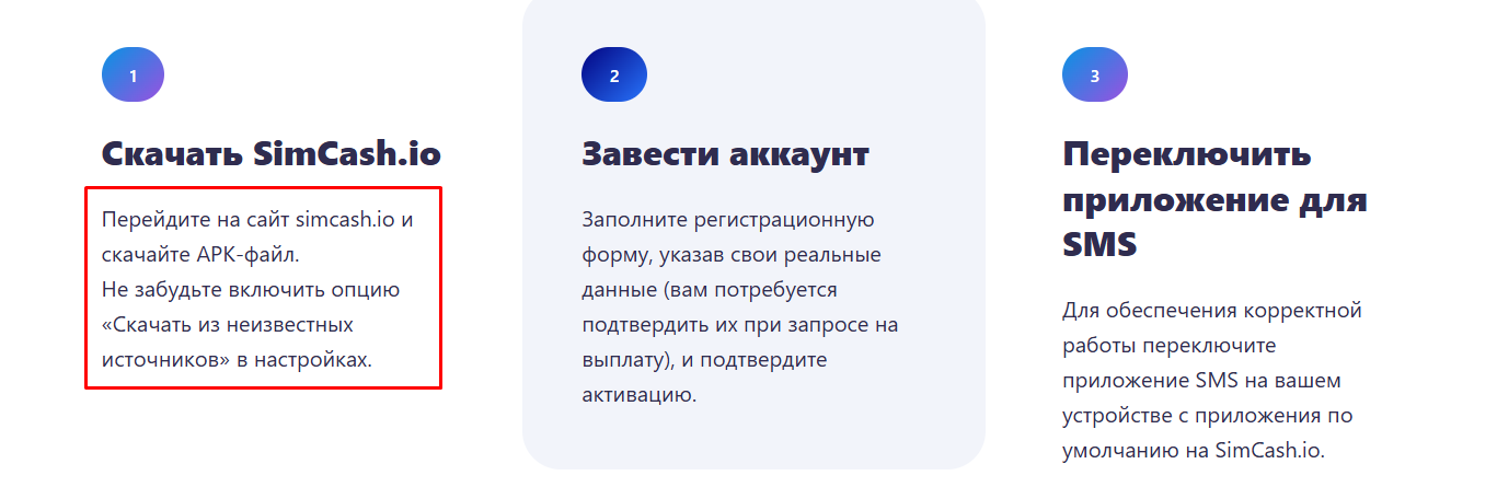 Для начала работы с Sim Cash на сайте предлагают следующий план:
