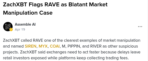 Второй — предупреждение авторитетного ончейн-следователя ZachXBT. В своем расследовании он отметил SIREN в числе шести токенов с подозрительной ценовой динамикой, аналогичной той, что наблюдалась у RaveDAO перед его крахом на 95%. Ключевой тревожный сигнал — около 47 кошельков контролируют примерно половину всего предложения токена. Крупные биржи после этого предупреждения заявили об изучении ситуации.