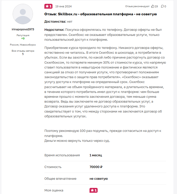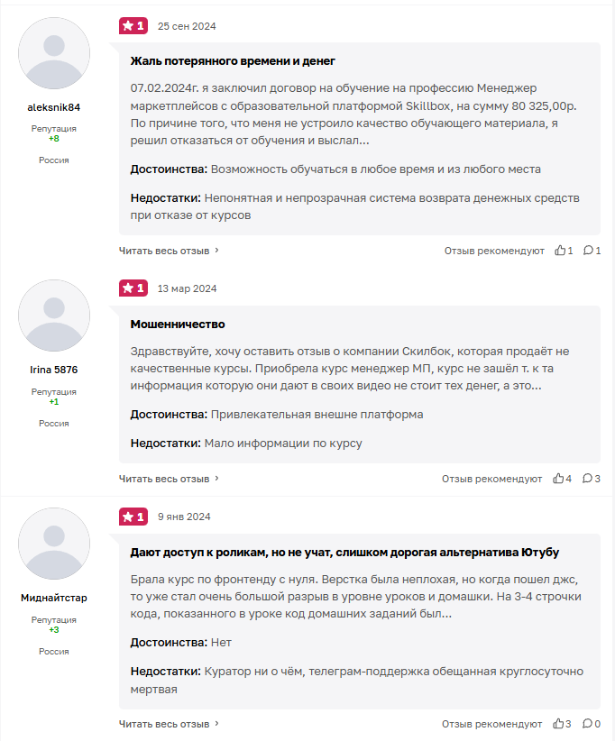 В то же время есть и резко отрицательные оценки. В основном жалобы сводятся к низкому качеству подачи и материала, много недовольства связано со сложностью возврата средств за обучение: