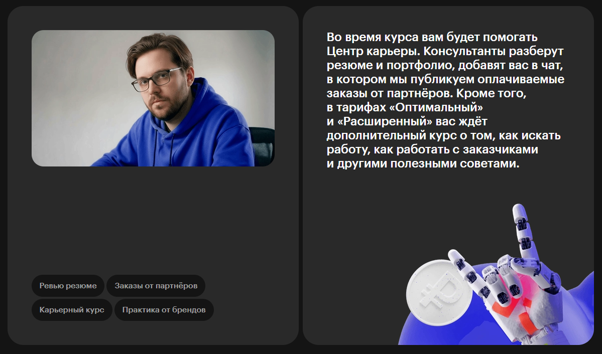 Дополнительно пользователям говорят о том, что на платформе работает центр карьеры, обеспечивающий содействие в трудоустройстве выпускников: