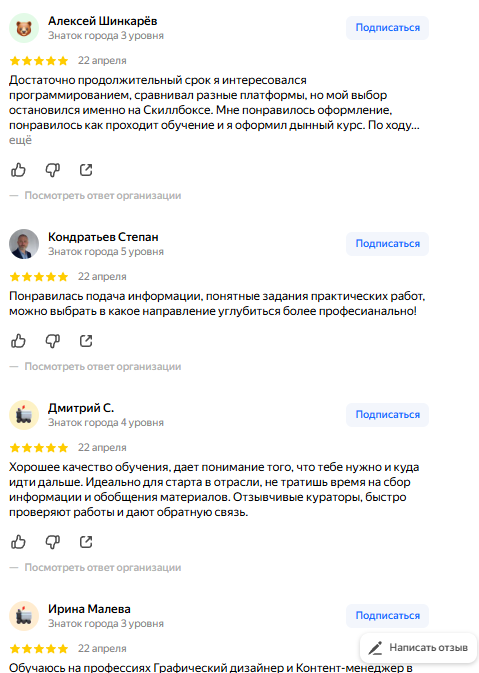 О курсе Skillboks AI креатор отзывов в сети не представлено, но есть огромное количество откликов об этой школе. Так, у платформы есть тысячи позитивных оценок на разных ресурсах, но в то же время не исключается накрутка, так как сразу по нескольку отзывов могут быть загружены одним днем.