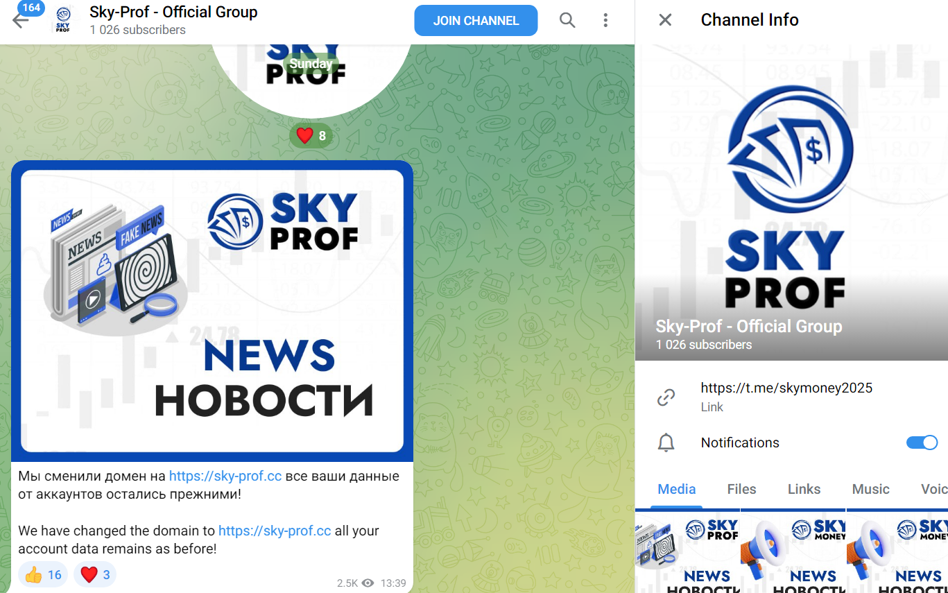 Изучить информацию о компании можно с помощью веб-ресурса sky prof cc. Ранее был доступен сайт sky inv cc, и его оформление было идентичным. Причина смены доменов не указывается. Ресурс можно настраивать на английский или русский язык.