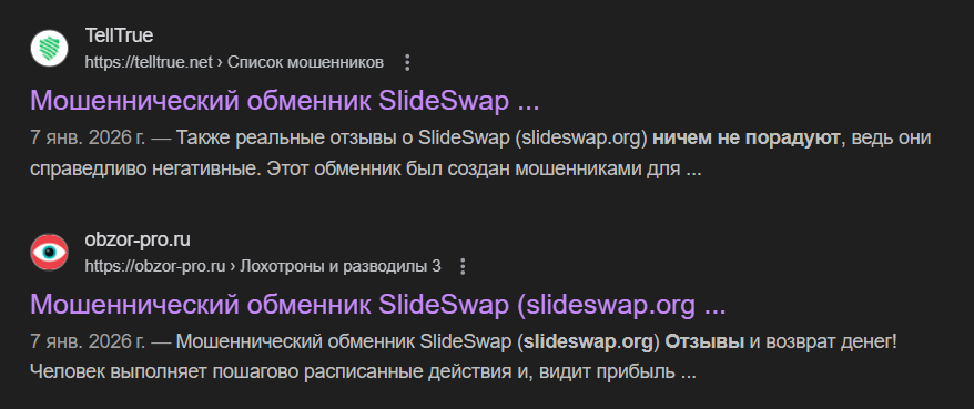 На январь 2026 года об обменнике SlideSwap org публикуются только негативные отзывы. Сервис включен в списки мошенников на разных сайтах. Деньги, отправленные для обмена, остаются в системе – вывести их не получится, а жалобы саппорту не дадут никаких результатов.