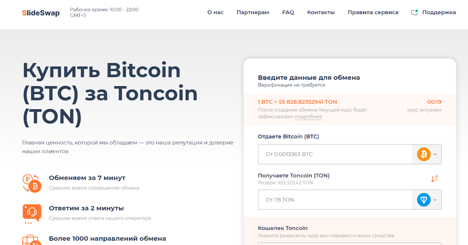 Рабочее время обменника указывается с 10:00 до 22:00 GMT+3, то есть заявки обрабатываются вручную, а значит, в пиковые часы с высокой долей вероятности придется ждать перевода дольше из-за очереди.