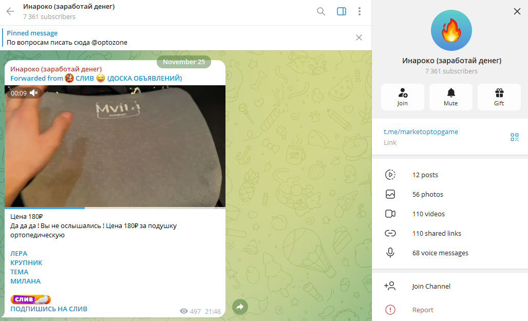 Инароко (заработай денег) – канал с 7,3 тысячей подписчиков, на котором предлагают самые низкие цены на товары для перепродажи.