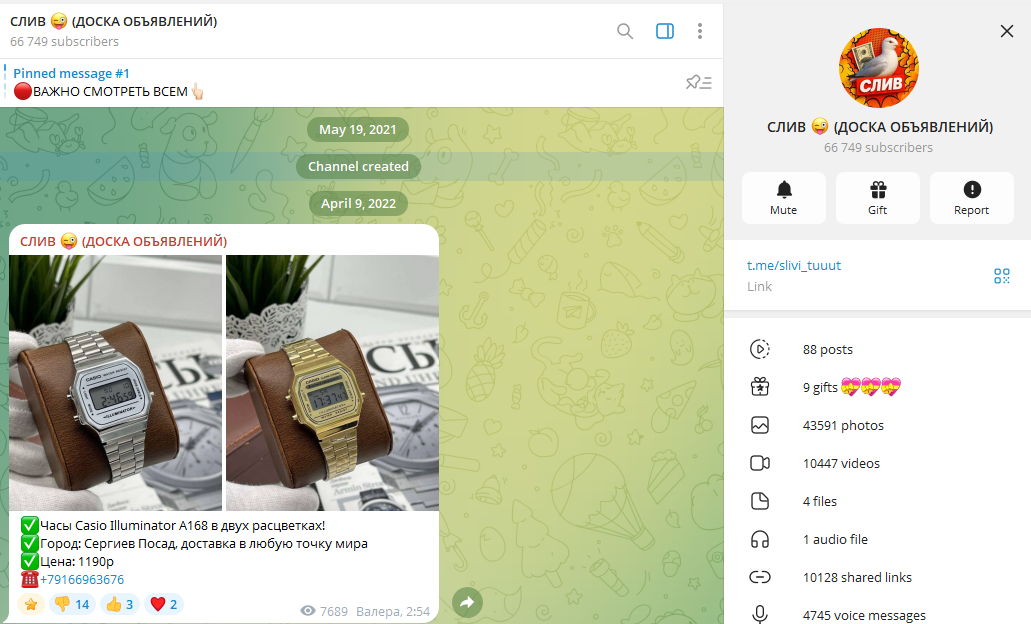 Одним из самых крупных сообществ в Тг является тот самый Слив Доска Объявлений. Сообщество было создано в мае 2021 года, но первая доступная публикация вышла