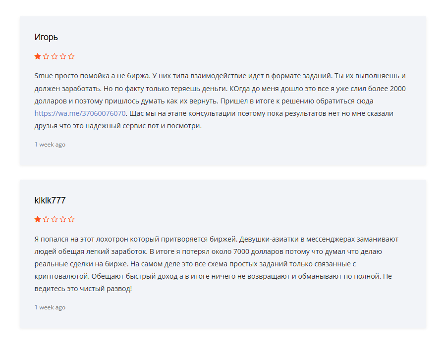 О бирже Smue отзывы в сети только негативные. Пользователи пишут, что их на платформу заманили девушки, которые сами написали в мессенджерах и предложили высокий заработок. По факту же оказалось, что никакой торговли на бирже нет, работа строится по принципу выполнения заданий, но с использованием криптовалюты. Клиенты вкладываются в крипту, но по итогу теряют все. Средства никто не возвращает.