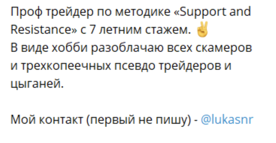 Администратор сообщества под ником LukaSNR говорит о семилетнем стаже в трейдинге, техническом анализе и финансовых «делах». Лука присваивает себе довольно громкие звания и достижения, вот только подтверждать их фактами не спешит.