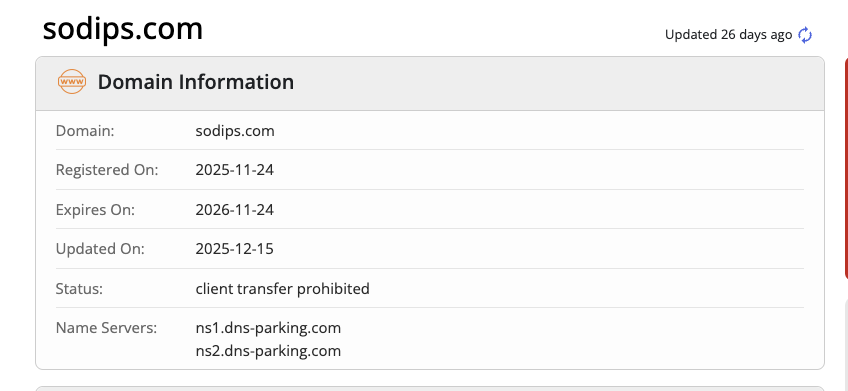Тем временем проверка возраста домена показывает, что его регистрацию sodips com провели только в конце 2025 года: