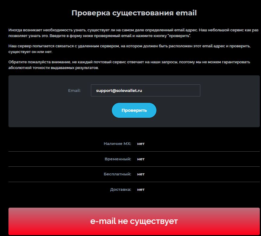 Что же касается контактных данных, можно увидеть, что указанный на сайте email для связи support@solewallet.ru вообще не существует: