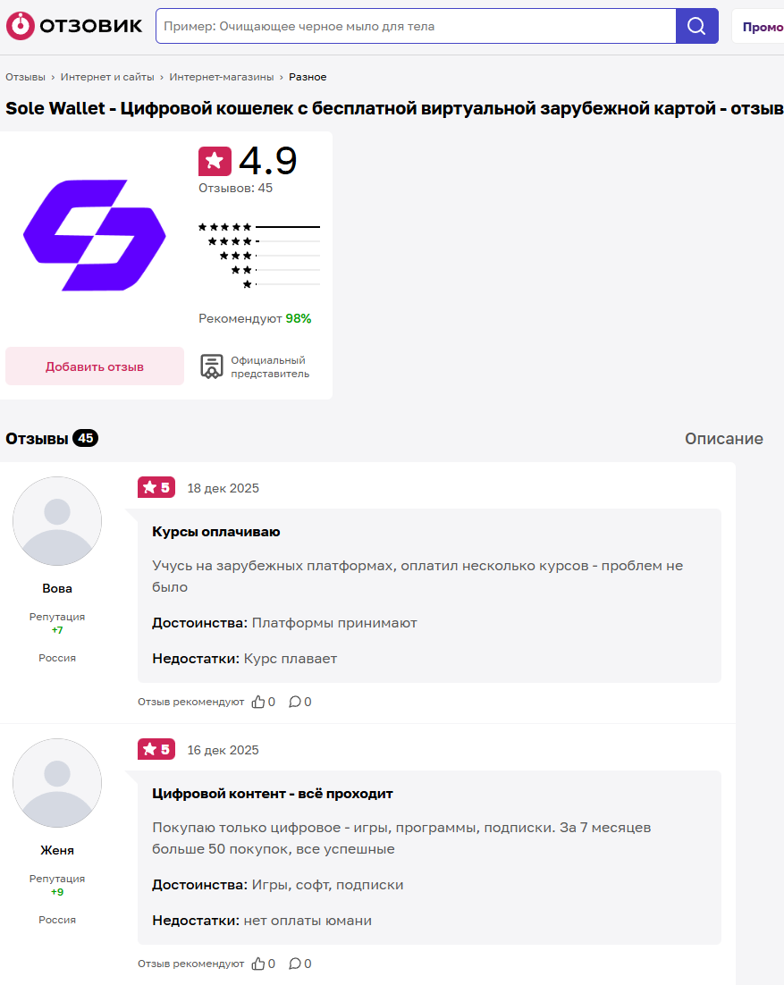 Сервис Sole Wallet отзывы в сети не получил. Хотя на сайте есть раздел с отзывами, в котором открывается интерфейс как у Отзовика, в реальности страница является поддельной.