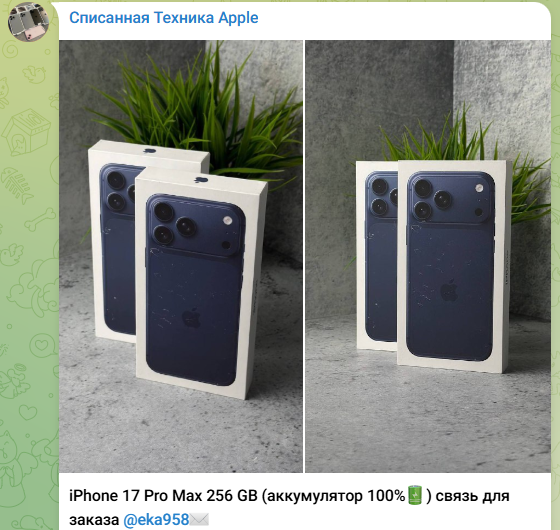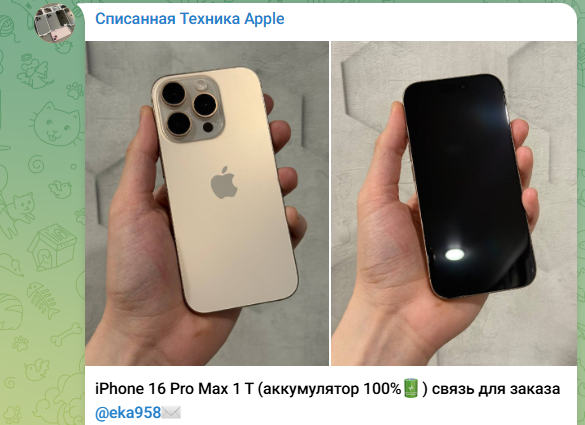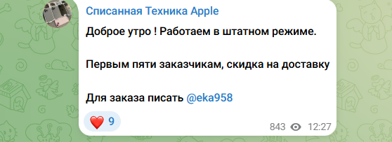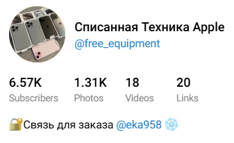 На канале магазина «Списанная Техника Apple» у Eka958 набралось больше 6 500 подписчиков. В контактах указан сам автор канала, которому нужно писать по поводу приобретения списанных телефонов.