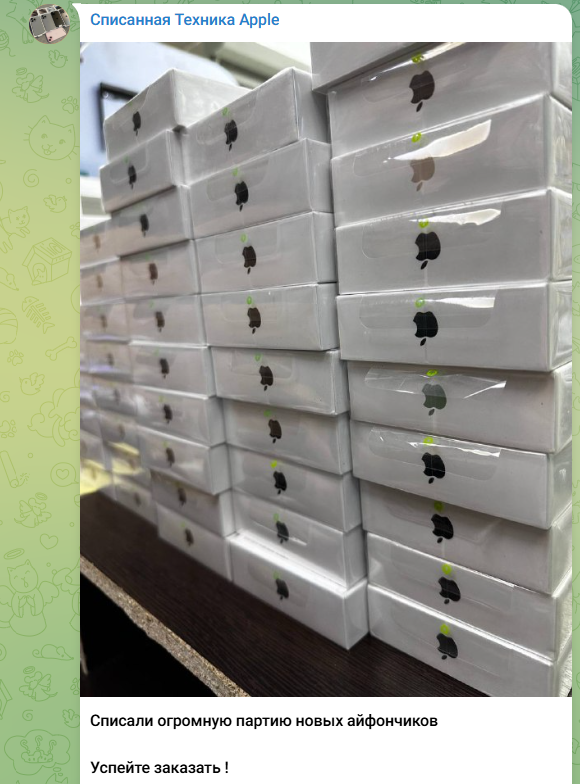 «Списанная Техника Apple» – телеграмм-канал, на котором авторы предлагают приобретать различные девайсы от компании Apple, которые якобы были списаны со складов и потому продаются в несколько раз дешевле чем в официальных магазинах. В основном на канале публикуются объявления по продаже телефонов, но есть и наушники AirPods и другие аксессуары бренда. В сети есть различные негативные комментарии о канале, поскольку его считают скамом, а авторов мошенниками.