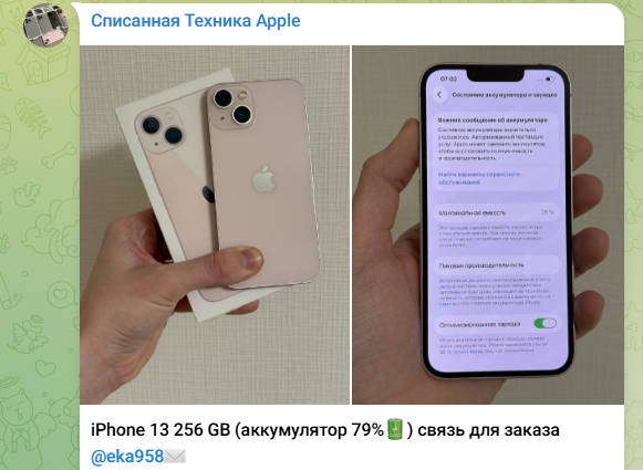 В телеграмм-канале магазина Eka958 не говорится заранее о стоимости той или иной модели продаваемых телефонов. Почти всегда единственная информация о iPhone, которую предоставляет автора – состояние аккумулятора и количество памяти в устройстве. О других характеристиках и причинах списания продаваемых моделей ничего не сообщается.
