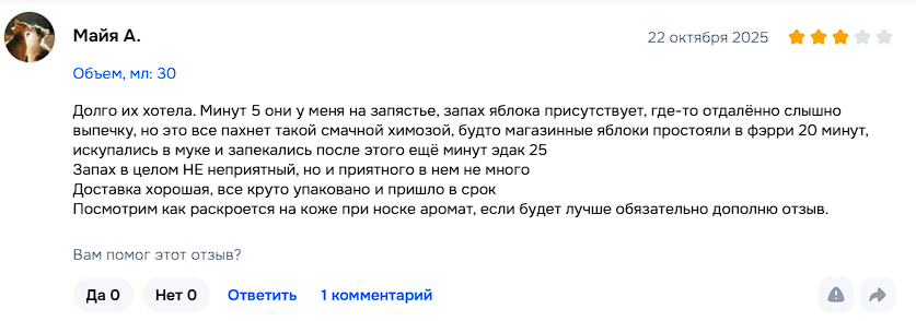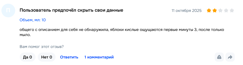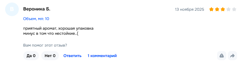 При анализе позиций на Ozon и Wildberries, можно заметить не только положительные отзывы, но и достаточное количество жалоб на духи. Клиенты отмечают, что вкус многих духов не соответствует описанию, а также чувствуется “химозный” запах, что указывает на низкое качество сырья. Вдобавок сплеши нестойкие, основной вкус держится первые 3-5 минут, а дальше выветривается, из-за чего польза от них сводится к нулю.