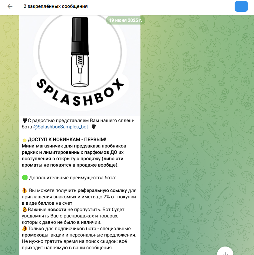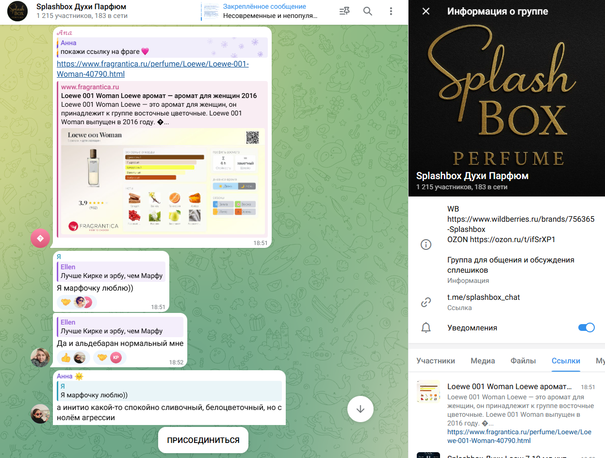 Среди социальных сетей разработчики SplashBox ведут телеграм канал и чат SplashBox | Парфюмерия, где подписчики могут свободно общаться. Есть отдельные модераторы, а также боты для проверки на человека через капчу и препятствия спаму, но никто просто так пользователей не ограничивает. Активность достаточно высокая, девушки регулярно обмениваются своим мнением с командой, указывают на минусы и плюсы не только их духов, но и от чужих фирм.