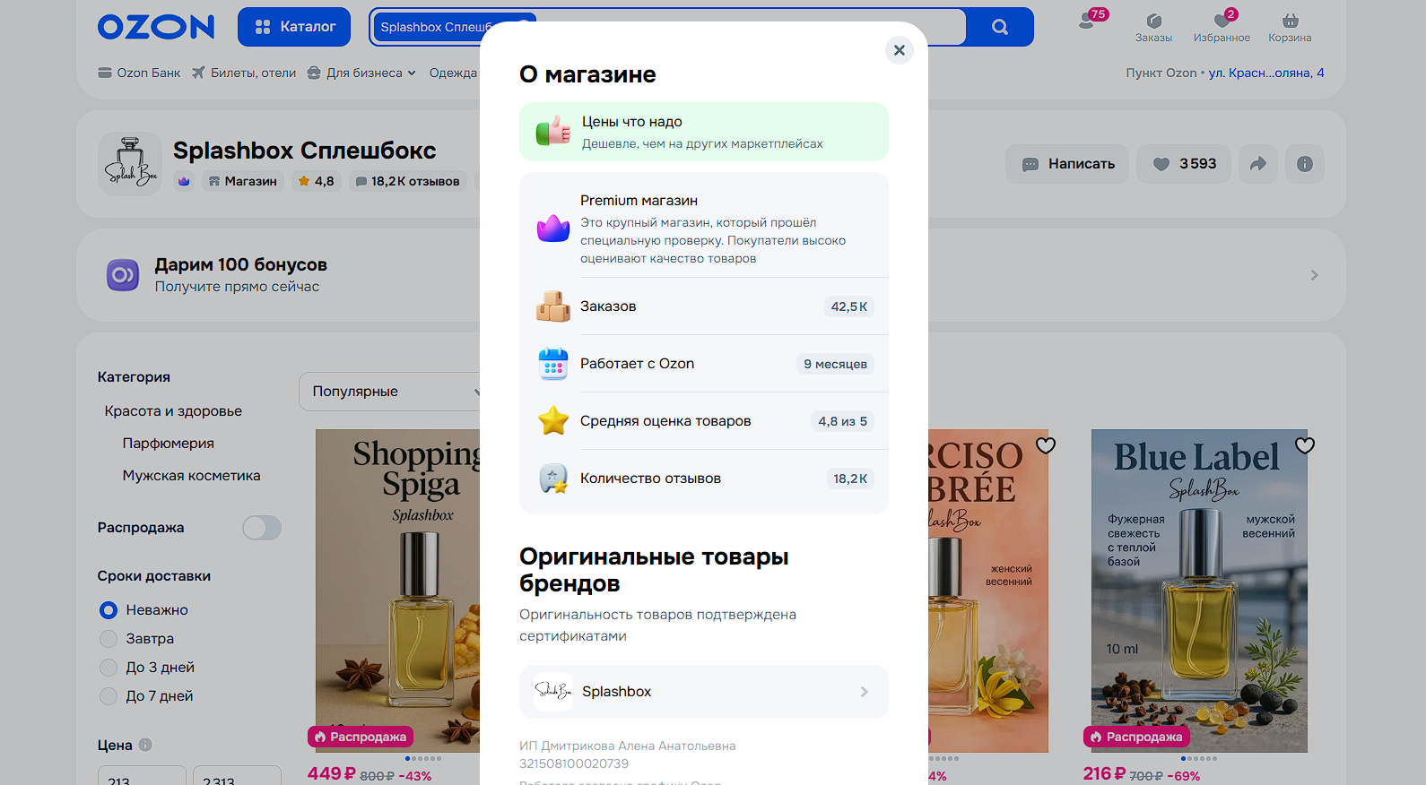 Начнем с анализа компании SplashBox. Хоть команда и предлагает заказывать товары через свой сайт, но они также доставляют парфюм через крупные маркетплейсы Ozon и WB. Отличие заключается в том, что там невозможно использовать индивидуальные скидки, баллы и акции, ведь платформы не предусматривают подобный функционал. Также на маркетплейсах у SplashBox есть статус Premium магазина, а сумма заказов превысила 40 тысяч со средним рейтингом около 4.8/5 звезд. Да, любая фирма может заказывать накрутку, но подобная активность уже исключает прямой скам или подмену духов.