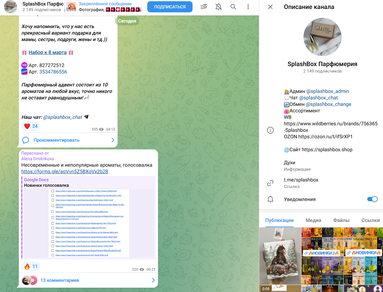 В телеграм канале обычно выкладывается информация, касательно новинок среди духов от SplashBox, а также появляются опросы, где у подписчиков спрашивают мнение, касательно выпуска новых вариаций духов. Везде прикрепляется артикул на Ozon/WB. Команда нередко экспериментирует и предлагает несовременные/непопулярные ароматы на выбор. Такой подход позволяет найти новые удачные комбинации и привлечь новых клиентов.