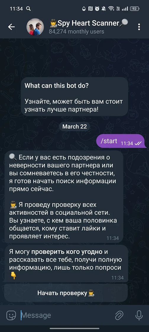 Telegram и соцсети не предоставляют таких данных ни открыто, ни через сторонние API. У Scancrushbot не было ни сайта, ни контактной информации, ни публичных каналов поддержки. Все платежи шли через анонимные реквизиты, что типично для мошеннических схем. Еще один момент — большое количество негативных отзывов о Spy Heart Scanner: много людей, которые поверили мошенникам, лишились своих денег. Судя по данным мониторинговых сервисов, в 2024 году количество пользователей бота превышало 100 тыс. человек. Его разработчики использовали для развода подписчиков их эмоции: ревность, недоверие, любопытство.