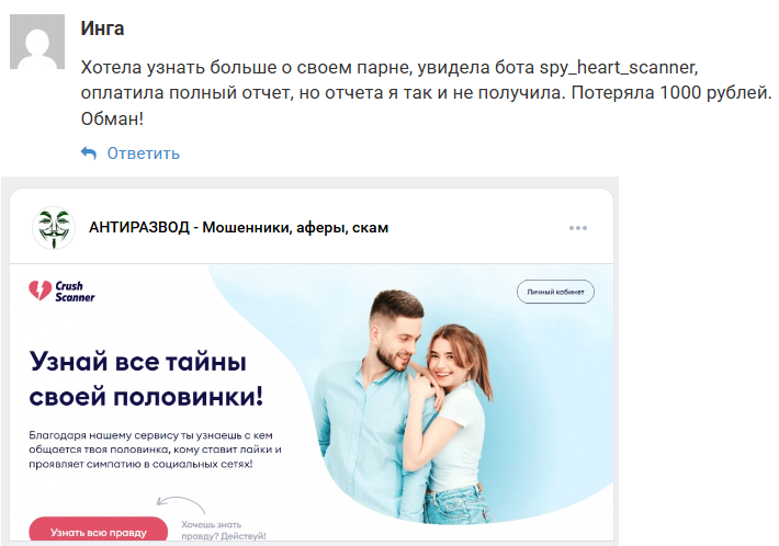 Про Spy Heart Scanner в Телеграмме и на сторонних ресурсах люди оставляют только негативные отзывы. В своих комментариях они жалуются на то, что им не предоставили подробного отчета даже после оплаты услуги. Профильные паблики предупреждают о мошенническом характере проекта.