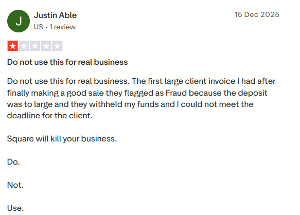 Square — это просто катастрофа для любого бизнеса! Они внезапно блокируют аккаунты без объяснений, удерживают до 30% средств, а их поддержка — сплошные отписки. Комиссии за транзакции заоблачные, а PoS-терминалы стоят немалых денег. С таким сервисом можно только потерять клиентов и деньги. Не связывайтесь с ними, если не хотите угробить свой бизнес!