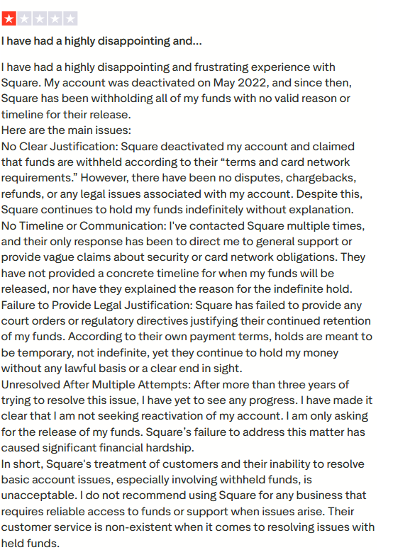 Square позиционирует себя как универсальное решение для продавцов, но на практике их сервис оказывается крайне ненадежным. Комиссии за транзакции завышены: 2,6% + $0,1 за электронные платежи и 3,5% + $0,15 при ручном вводе данных. Однако настоящая проблема кроется в произвольных блокировках аккаунтов без объяснения причин, что приводит к удержанию 20-30% средств продавцов. Служба поддержки игнорирует жалобы, ограничиваясь шаблонными ответами. Такая политика ставит под угрозу бизнес пользователей, делая сотрудничество с Square неоправданно рискованным.