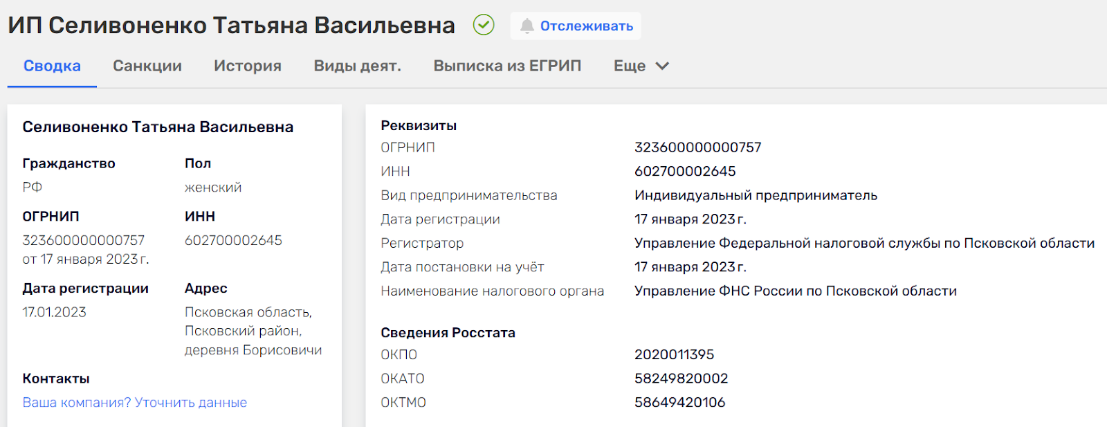Юридические услуги предоставляются от лица ИП Селивоненко Татьяны Васильевны, зарегистрированной в Псковской области. Заметим, что на многих подобных проектах разработчики публикуют чужие реквизиты и никаких доказательств связи с представленным ИП у Антона нет.