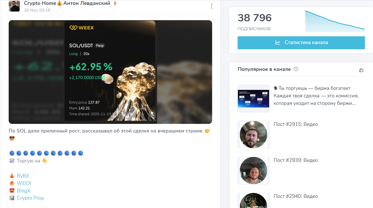 Результаты сделок Антона демонстрируются в виде картинок с нарисованными процентами прибыли. Под рядом записей он дает свои ссылки на ряд бирж и крипто проп. В новостях можно увидеть поверхностную аналитику, впрочем растянутую на размеры лонгридов, и моменты из личной жизни финансового наставника. Посвящая подписчиков в приватную сферу и демонстрируя на камеру свою семью, многие трейдеры пытаются создать иллюзию открытости и “хорошего знакомого” для участников проекта.