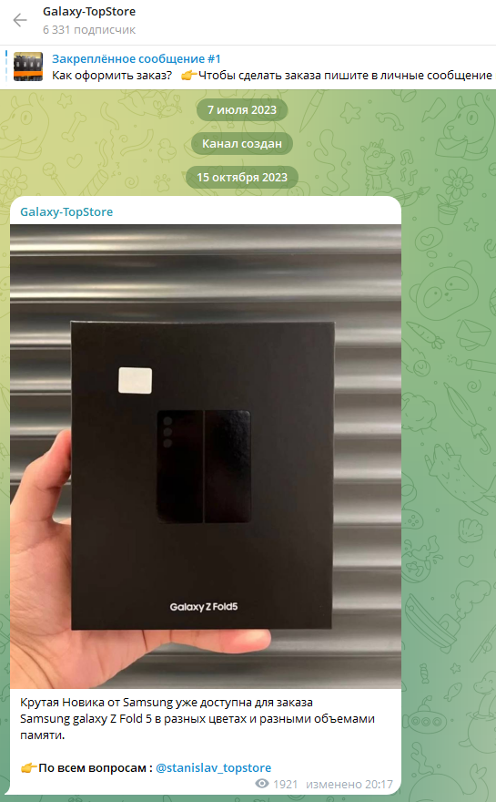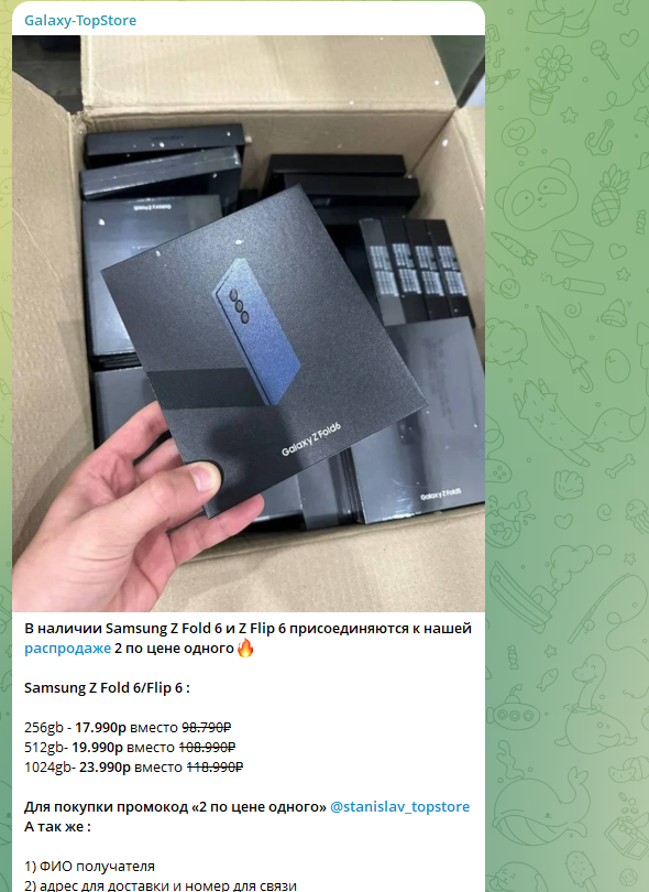 В TG Stanislav TopStore действительно выкладывает объявления о доступных устройствах, чаще всего, это смартфоны и техника бренда Samsung. При этом многие телефоны продаются гораздо дешевле рыночной цены – например, Samsung Z Fold 6 предлагают приобрести всего за ₽17,990.