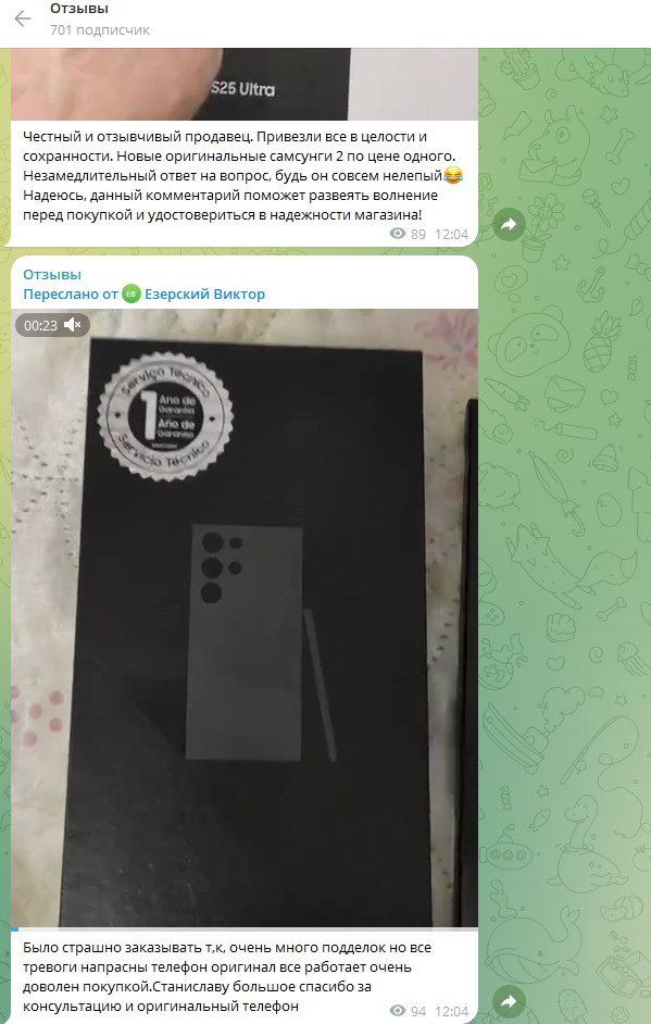 У магазина есть второй канал, на котором выкладывают отзывы покупателей, там тысячи записей с положительным откликом клиентов. Нам кажется, что это фейковые комментарии, так как нигде не упоминается реальное название сообщества, а ролики слишком абстрактные и могут быть украдены из открытых источников.
