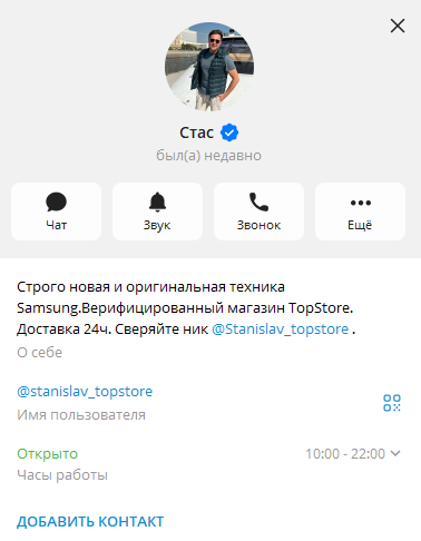 В описании канала указан профиль @stanislav_topstore, это единственный способ связи с администрацией проекта. Нигде не указан адрес магазина, его реквизиты или прочая информация, что позволяет судить об отсутствии регистрации и повышенном уровне риска, так как покупка техники у частного лица не гарантирует защиту прав потребителя.