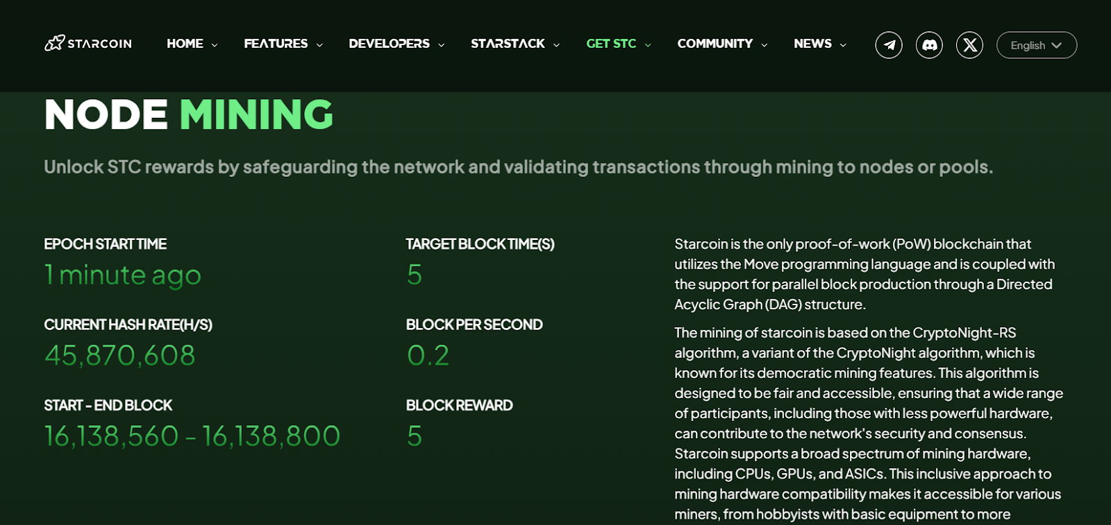 Заработок токена STC возможен единственным способом — покупка нод для майнинга. Добыча криптовалюты происходит согласно разновидности алгоритма CryptoNight — CryptoNight-RS и обеспечивает не только безопасность сети, но и доступность для участников с оборудованием малой мощности. Майнить можно на видеокартах, асиках и процессорах. Блок добывается каждые 5 секунд, награда 5 STC. Для майнеров предложено скачать кошелек Стар Койн, исходный файл есть на Github, также доступно расширение в браузере Google. Для установки нод на платформе есть подробный гайд, но все инструкции даны на английском языке.