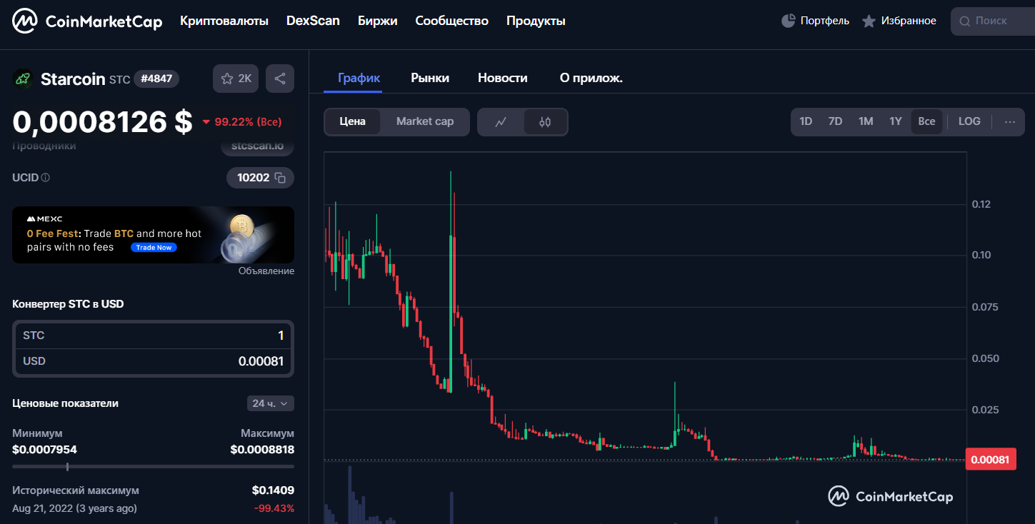 Проект Starcoin — это очередная попытка заманить инвесторов в криптовалютный пузырь. С рыночной капитализацией менее 350 тысяч долларов и историческим максимумом в 0,14 доллара, сейчас его цена едва превышает 0,001 доллара. Отсутствие сертификатов безопасности, низкий интерес со стороны пользователей и непрозрачная токеномика делают этот проект крайне рискованным. Если вы хотите потерять деньги — это ваш шанс.