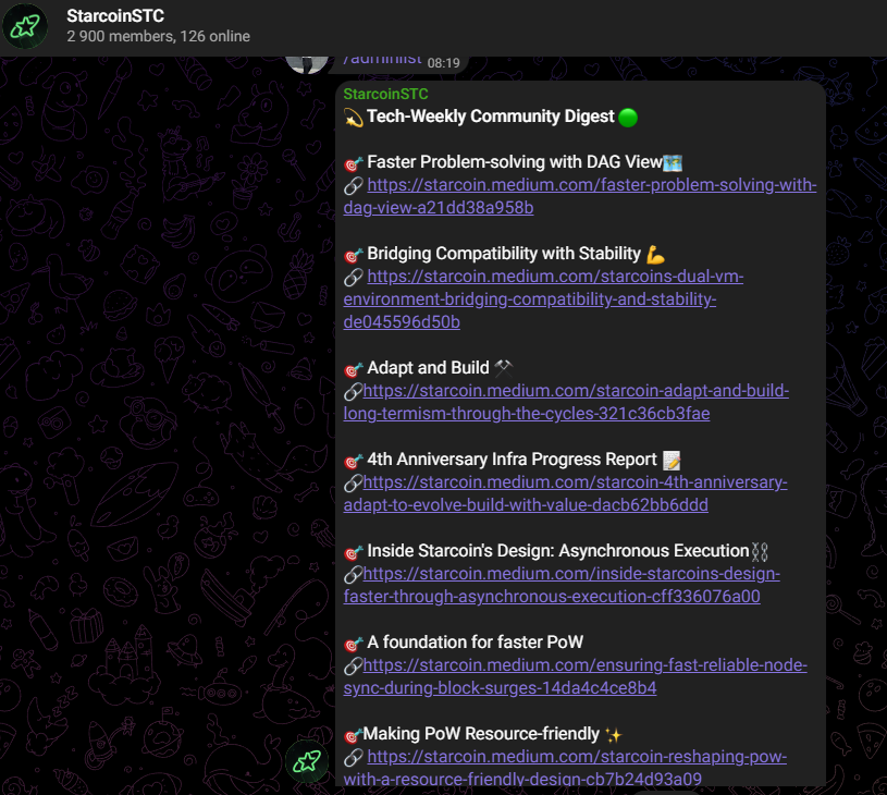 - Телеграмм чат StarcoinSTC читает 2900 пользователей, а вот пишет в нем около сотни человек, реакций практически не бывает. Публикуют новости проекта, в том числе о скорости добычи блоков.