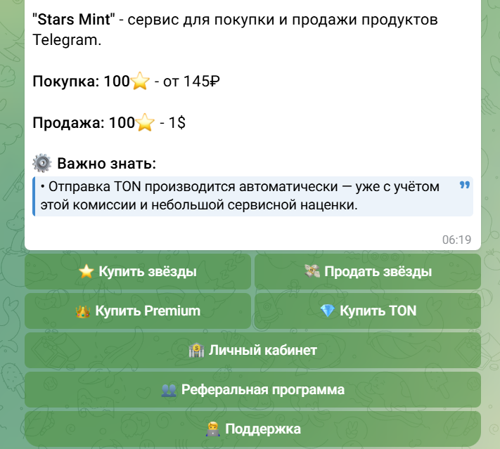 После выполнения задания необходимо проверить подписку и получить доступ к самому боту Stars Mint Bot. Сразу после входа клиентам предлагают купить 100 звезд по цене от 165 рублей. Также доступна продажа по курсу 1 USD за звезду.