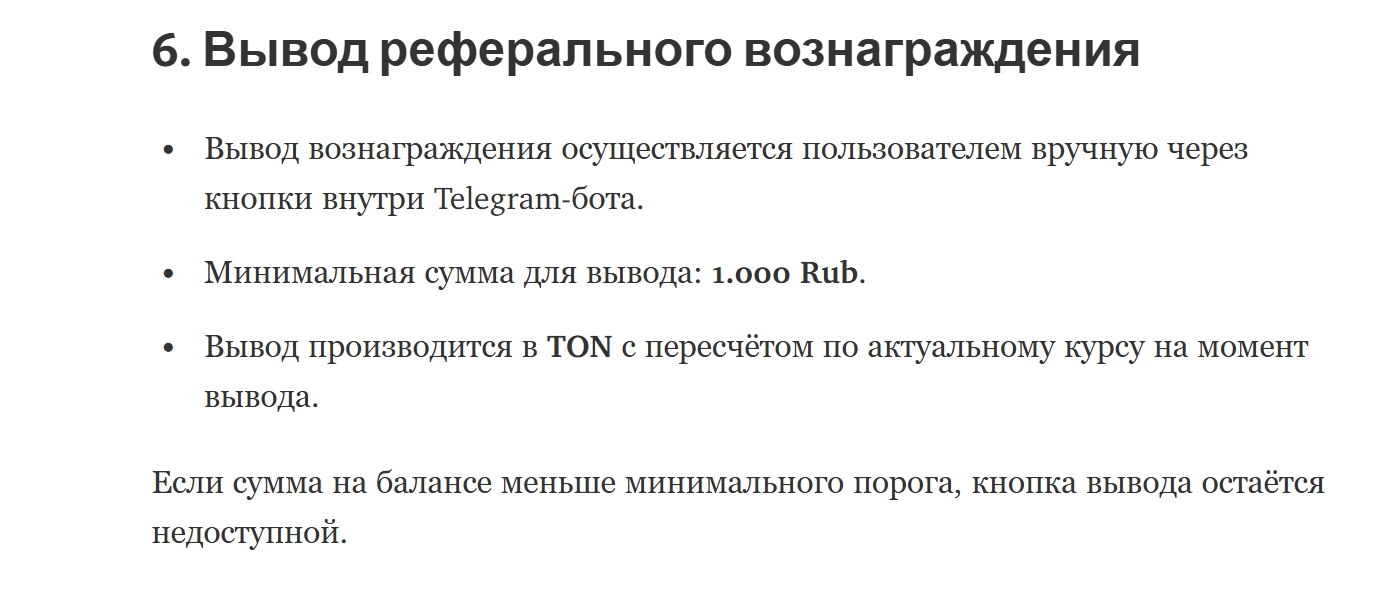 Размер заработка зависит от активности реферала. Он может составлять от 20 до 65% при тратах от 100 до 50 000 рублей. После достижения очередного уровня применяется повышенный процент. Вывод денег возможен при достижении суммы в 1000 р. Оплата осуществляется в ТОН, а курс может меняться с учетом рыночной ситуации.