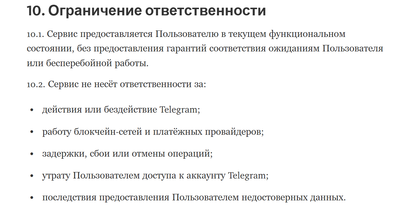 Администрация заявляет о необратимости операций, которые проводятся на платформе. При этом сервис не может прекращать или приостанавливать предоставление услуг. Также платформа Stars Mint снимает с себя ответственность за следующие действия:
