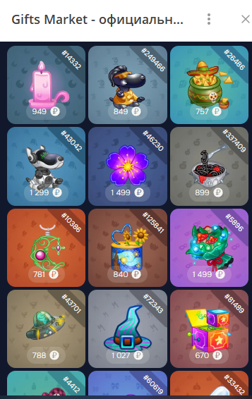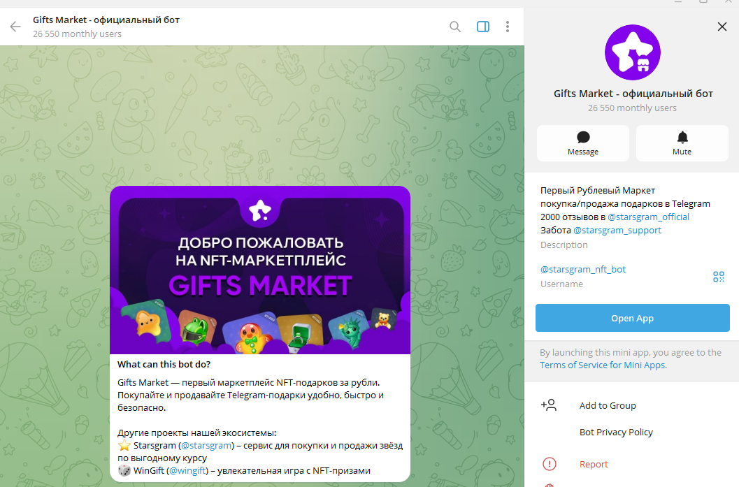 Бот Gifts Market – платформа, которая позиционируется как первый рублевый маркет подарков в Телеграм. Хотя НФТ-гифты – достаточно популярное явление в РФ, самого бота запускает не так много пользователей.