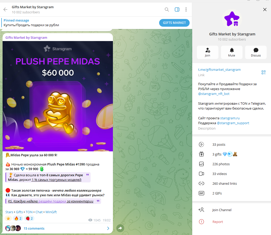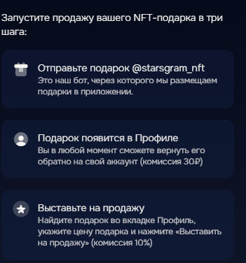 Starsgram Nft Bot – Телеграм приложение от создателей сервиса для покупки звезд и Телеграм-премиум Starsgram. Это приложение представляет собой НФТ-маркетплейс, в котором можно купить и продать Телеграм-гифты за рубли. Сервис не пользуется особой популярностью, отзывов о нем в сети нет. Поэтому мы провели собственный разбор деятельности платформы, чтобы оценить перспективы его использования.