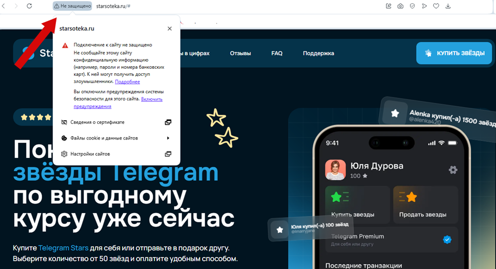Официальный сайт расположен по адресу Starsoteka Ru. Домен имеет просроченный сертификат безопасности, что указывает на определенные организационные или технические проблемы у создателей, а также повышенные риски утери персональных данных при их передаче на сервер.